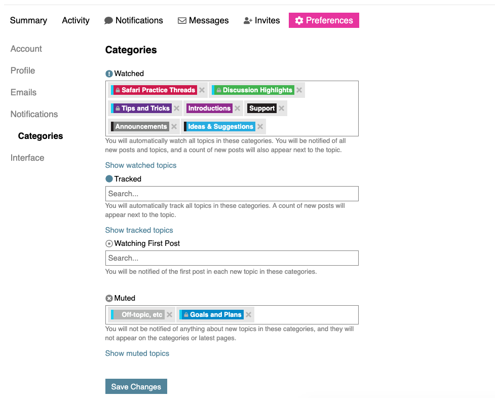 Heads up, with those categories no longer “watched” you will still receive replies to threads that you create/comment on, and if you haven’t visited the forum in a week you’ll get a weekly digest of activity to help you get caught up. You can tweak those settings under the notifications tab, just above the categories option.